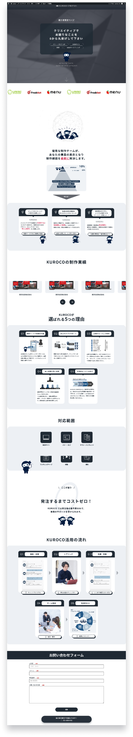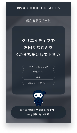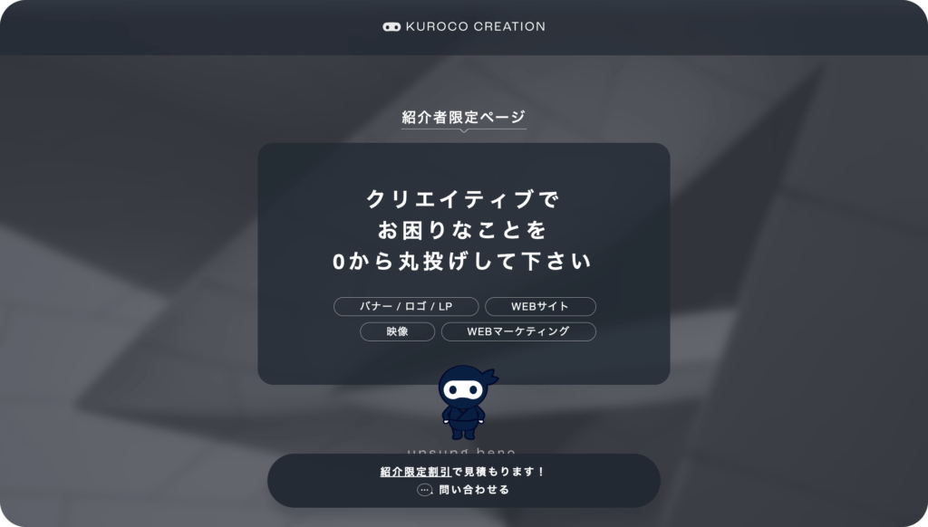 クライアント様のkuroco(黒衣)となって、暗躍するイメージに、可愛らしいkurocoのキャラクターを掛け合わせることでプロフェッショナル感と親近感を同時に感じられるテイストでデザインをしております。